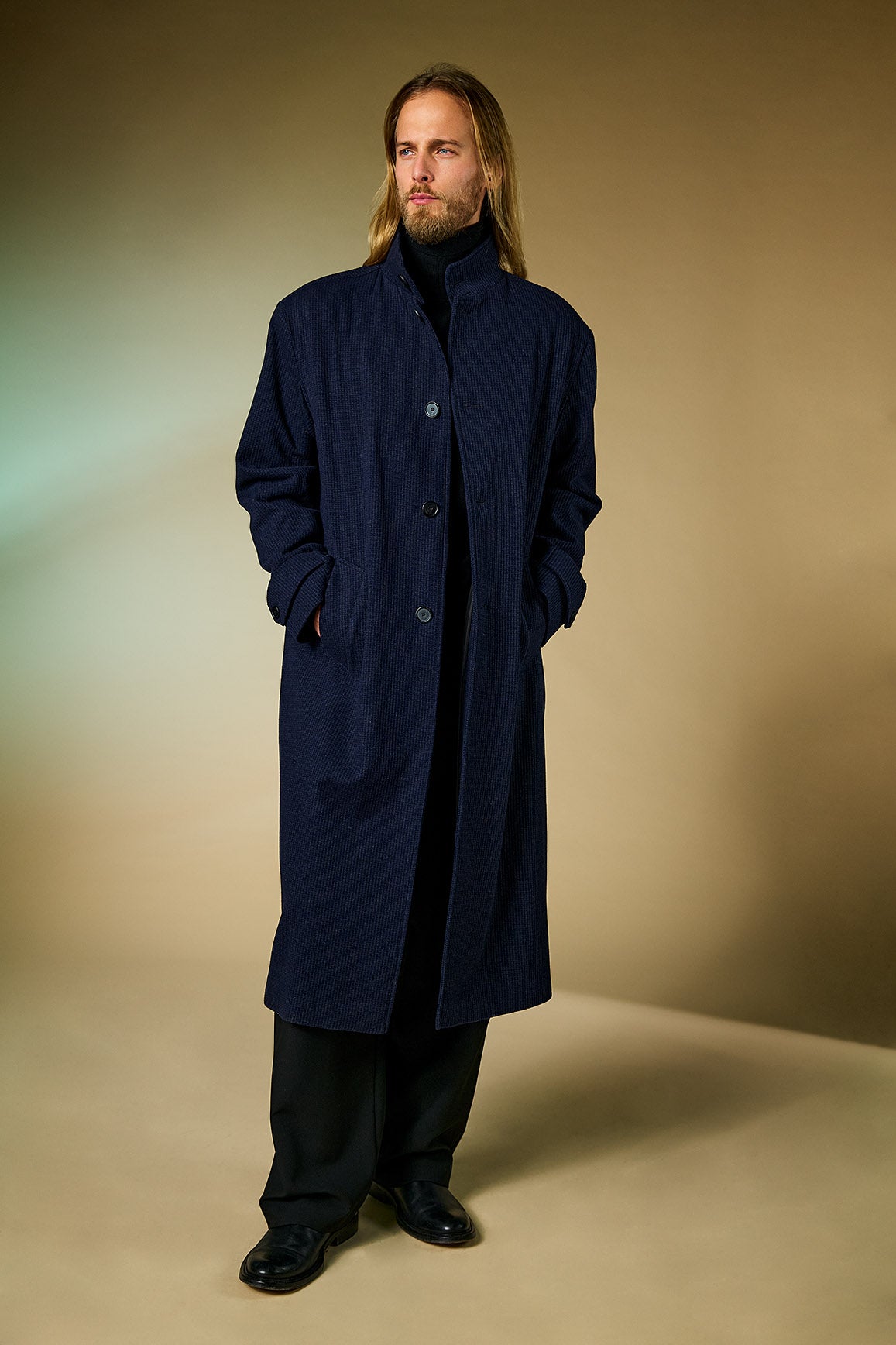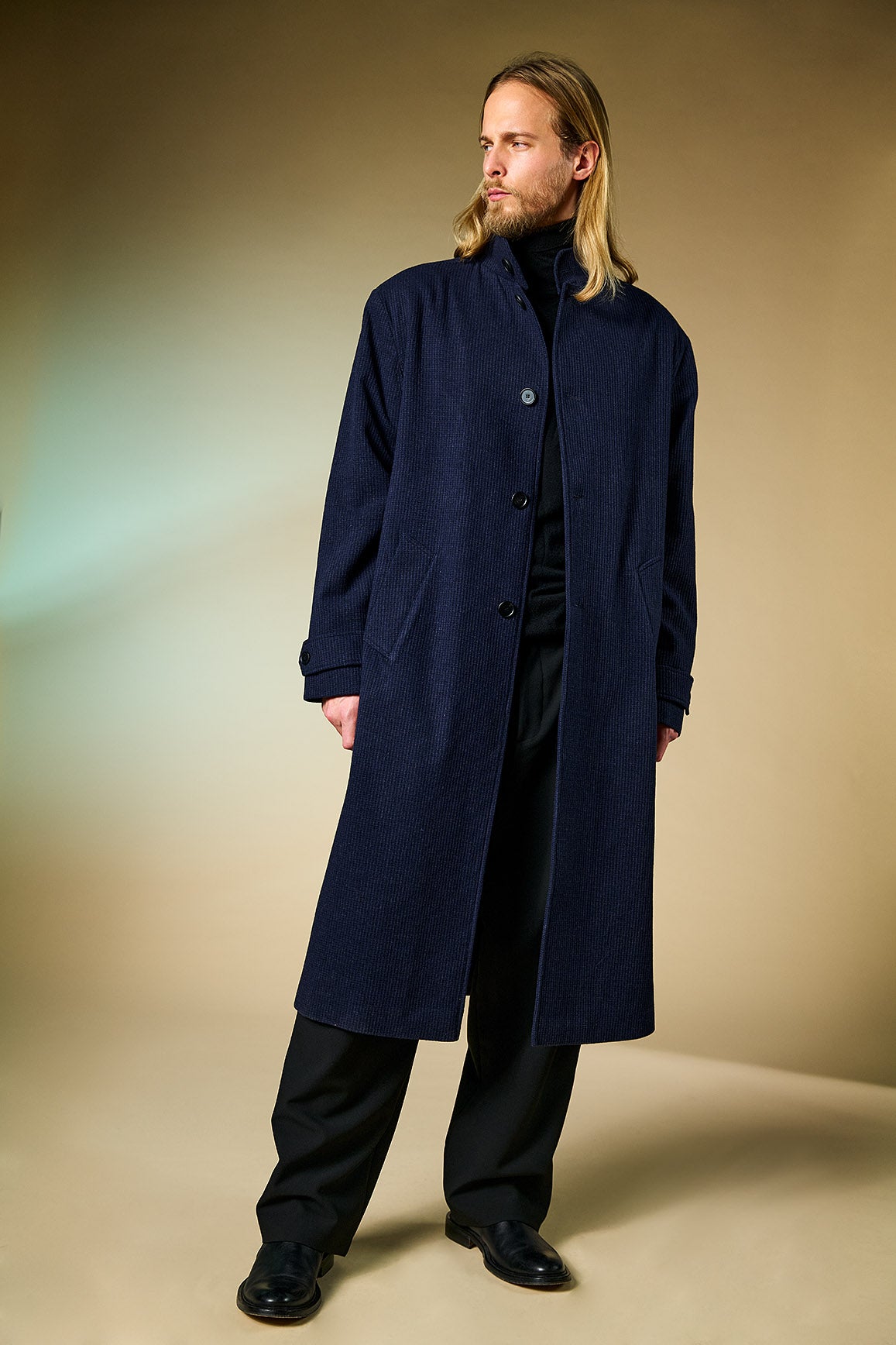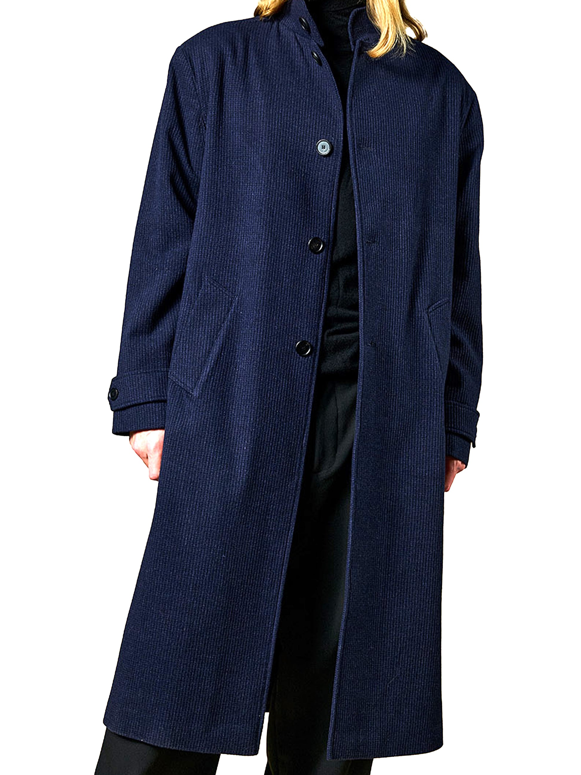 Ein hochwertiger Wollstoff mit Kaschmir- und Seidenanteil ist aus leichtem Gewicht perfekt dafür gewählt. Er wurde wasserabweisend ausgerüstet, damit er Wind und Wetter standhält. Ein wärmendes, weil wattiertes Futter unterstützt die Funktionalität für kalte Tage. Die klassische dunkelblaue Farbe im Minimuster aus schwarzen und blauen Garnen garantiert Zeitlosigkeit, ganz im Trend unserer Zeit.