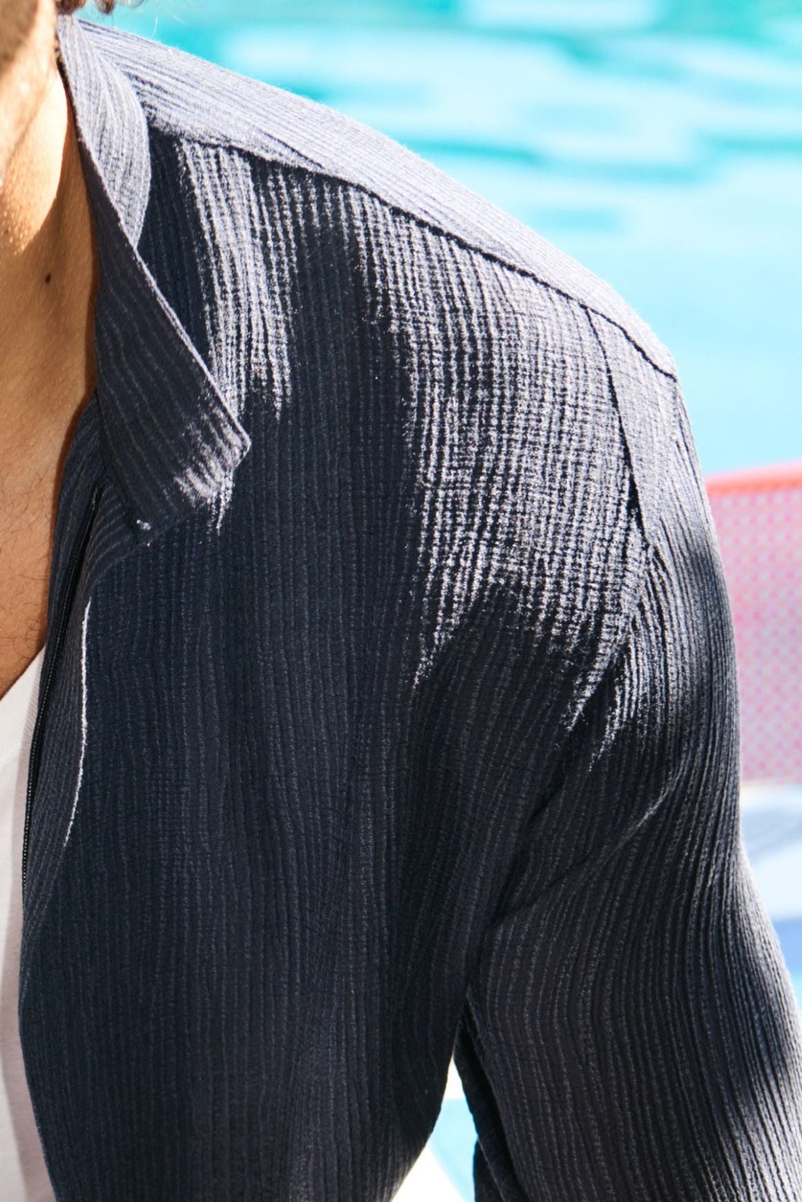 Ducale ist ein Reißverschlusshemd mit Stehkragen, das durch seine besondere Stoffqualität und eine markante Oberfläche überzeugt. Gefertigt aus einem edlen Material eines italienischen Webers, erhält das Modell seinen charakteristischen Look durch eine creppige Rippenstruktur, die Tiefe und Textur ins Design bringt.