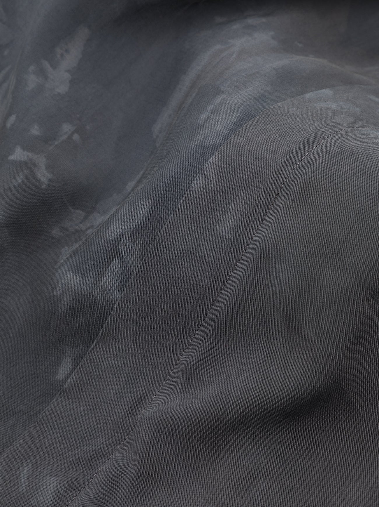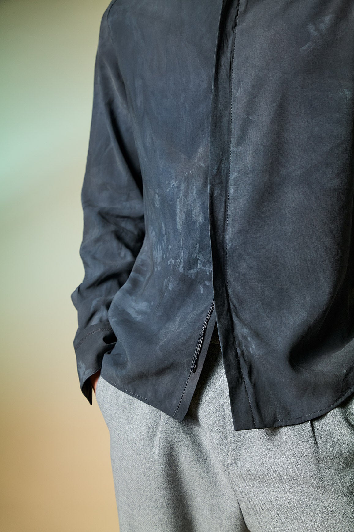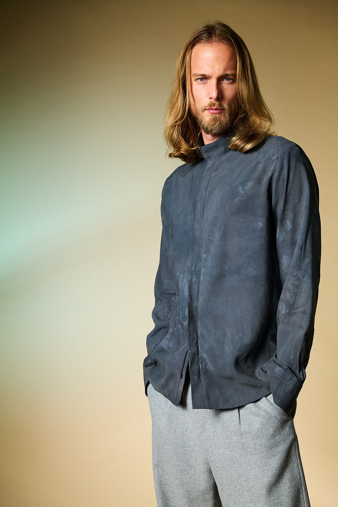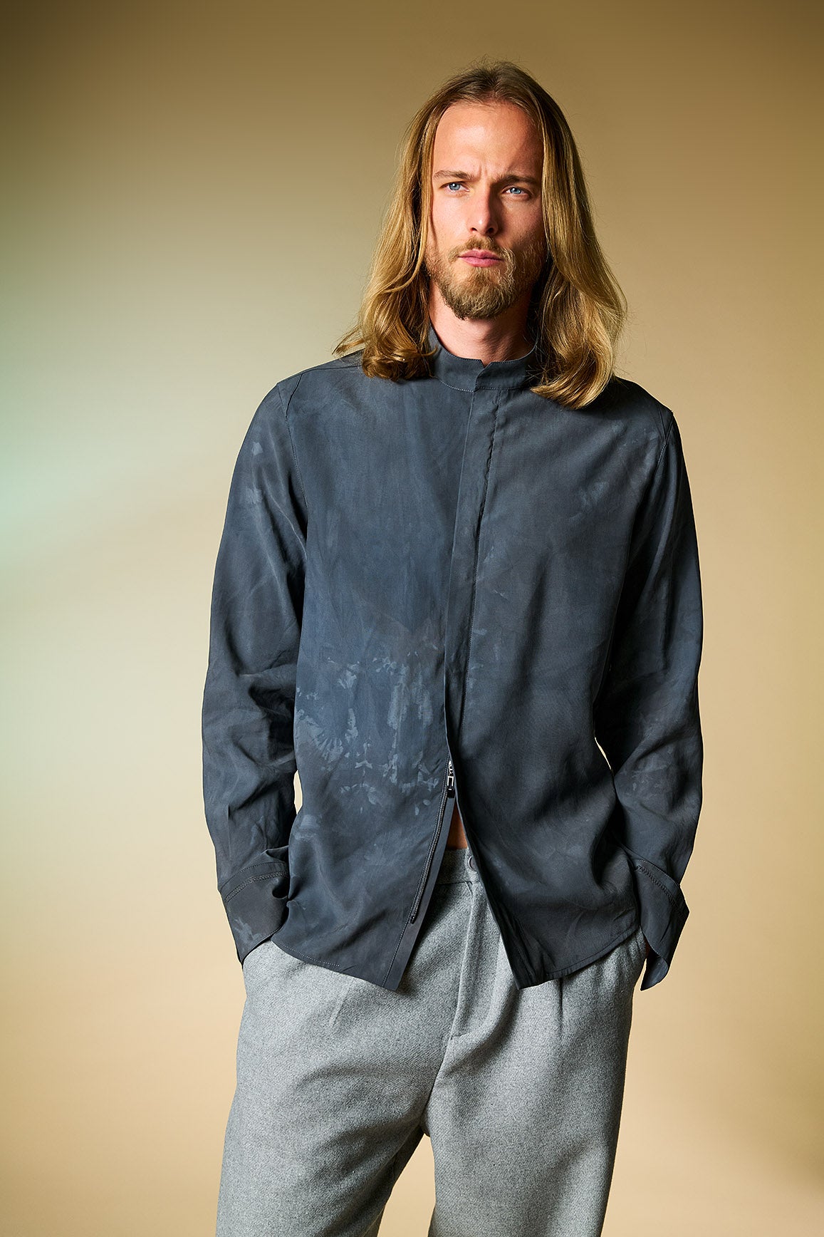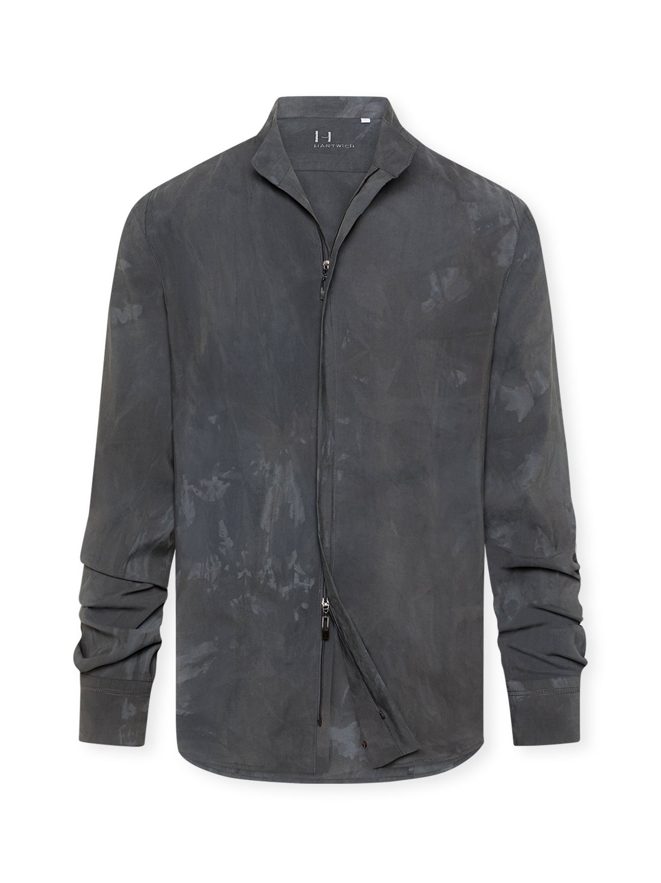 Das asphaltfarbene Reißverschlusshemd überrascht mit seiner unregelmäßigen Optik. Es liegt an der Mal-Tinto-Färbung, der speziellen Färbetechnik aus Italien, die gekonnt unperfekt erscheint und so jedes Item zu einem Unikat macht.