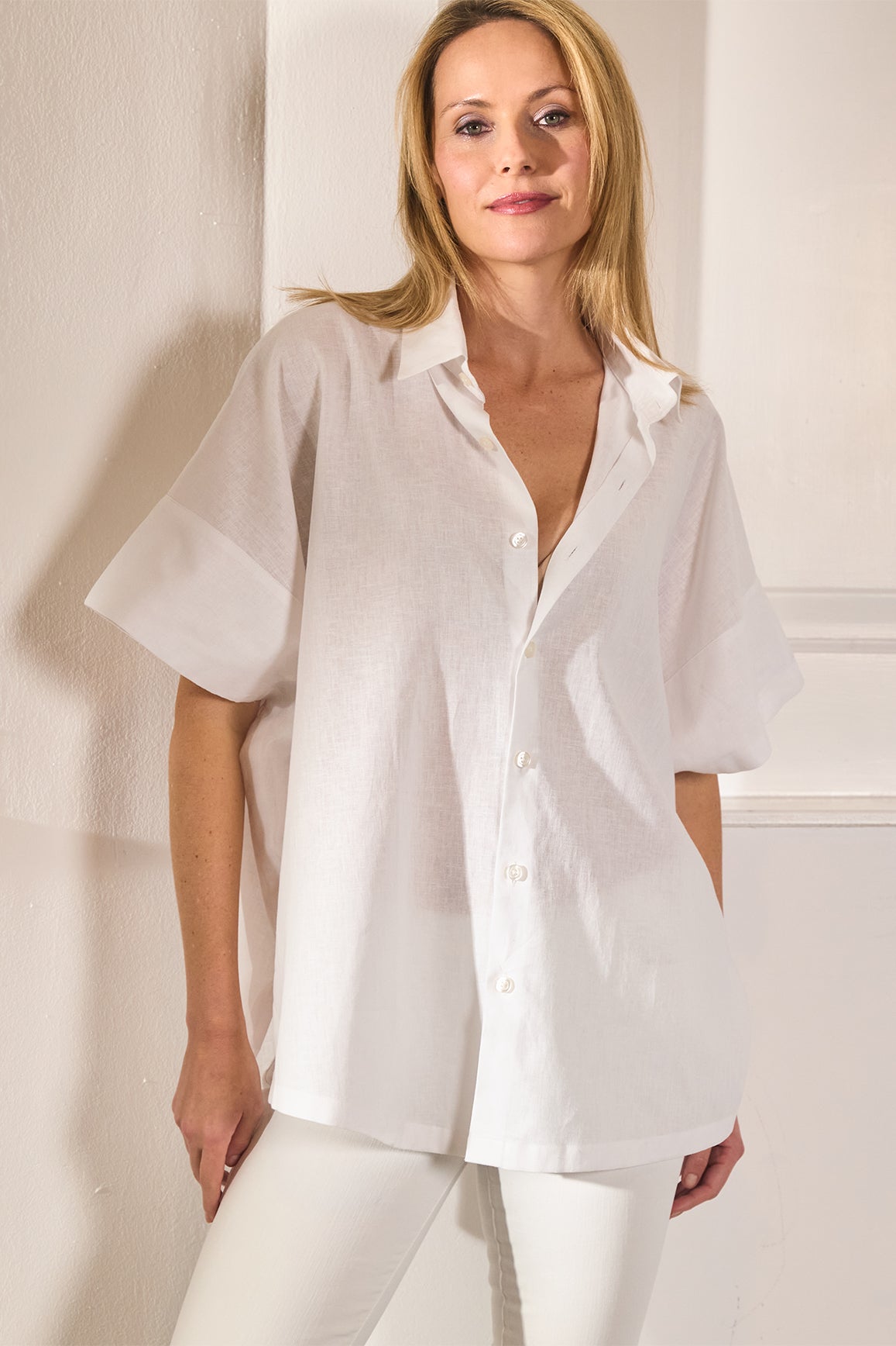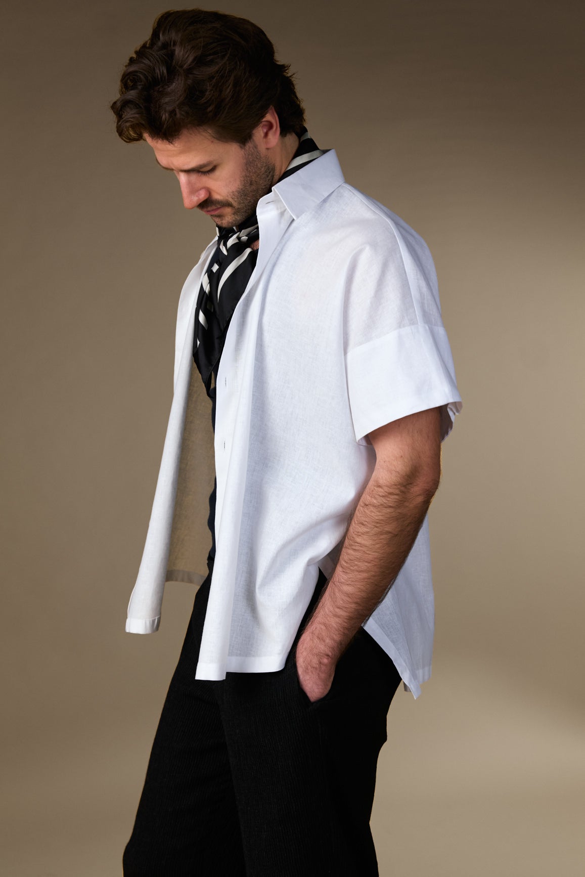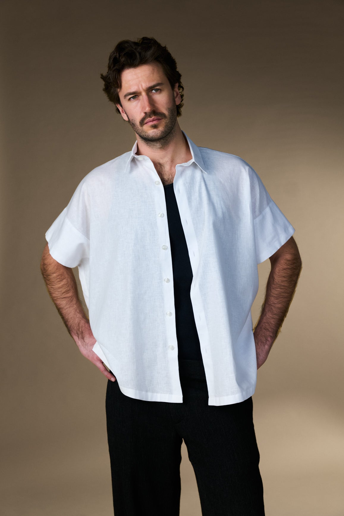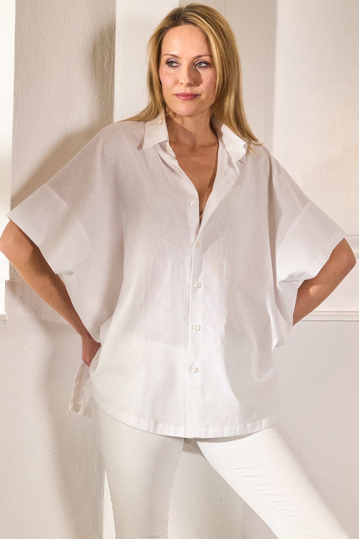 Ein Hemd nicht nur für Männer. Der weite, unkonstruierte Schnitt im Unisex-Stil erinnert an einen Kimono und ist durch seine Luftigkeit ideal für wärmere Tage. Den lässigen, sommerlichen Auftritt unterstützt die Baumwoll-Leinenmischung. Der klassische Kentkragen kontrastiert den lässigen Style.