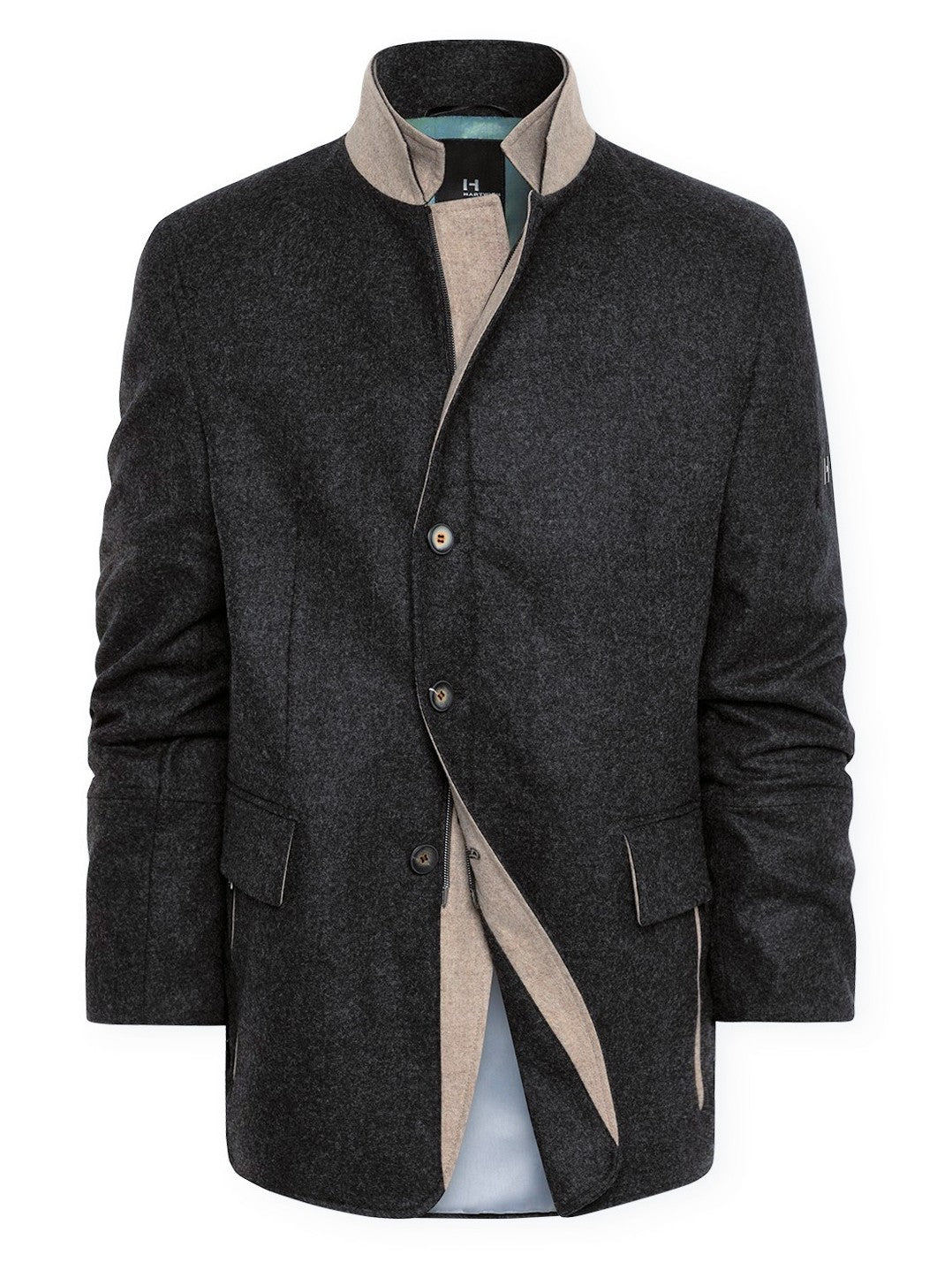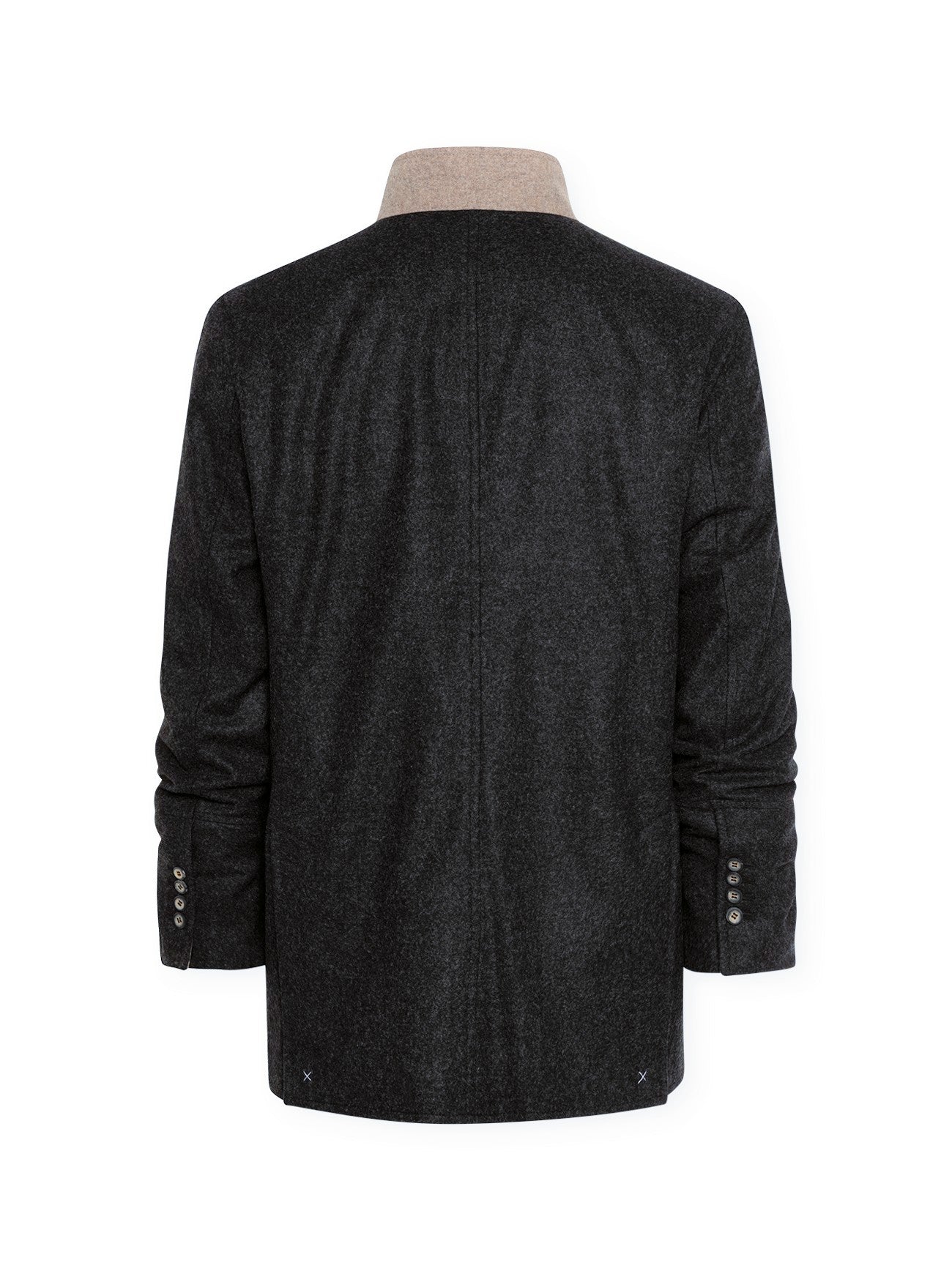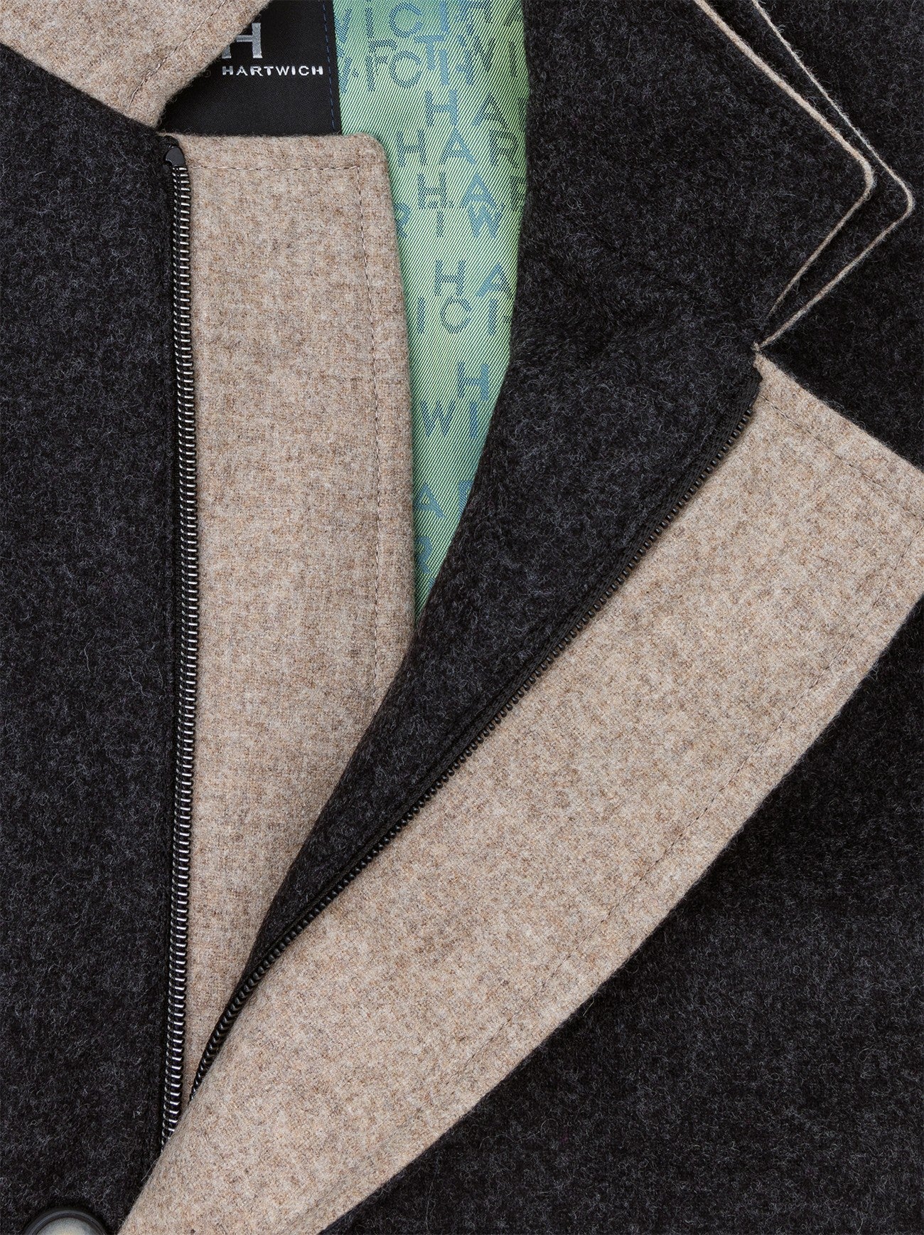 Eine Outdoorjacke im Alpenstyle aus bayrischem Loden in anthrazit mit Kontrastpartien in camel. Loden steht für den Geschmack des Echten und Unverfälschten. Die Alpen-Jacke aus bayrischem Loden ist eine Referenz an die Münchner Wahlheimat der Designerin. Loden ist besonders widerstandsfähig und wird wegen seiner Wind- und Regendichtigkeit geschätzt.