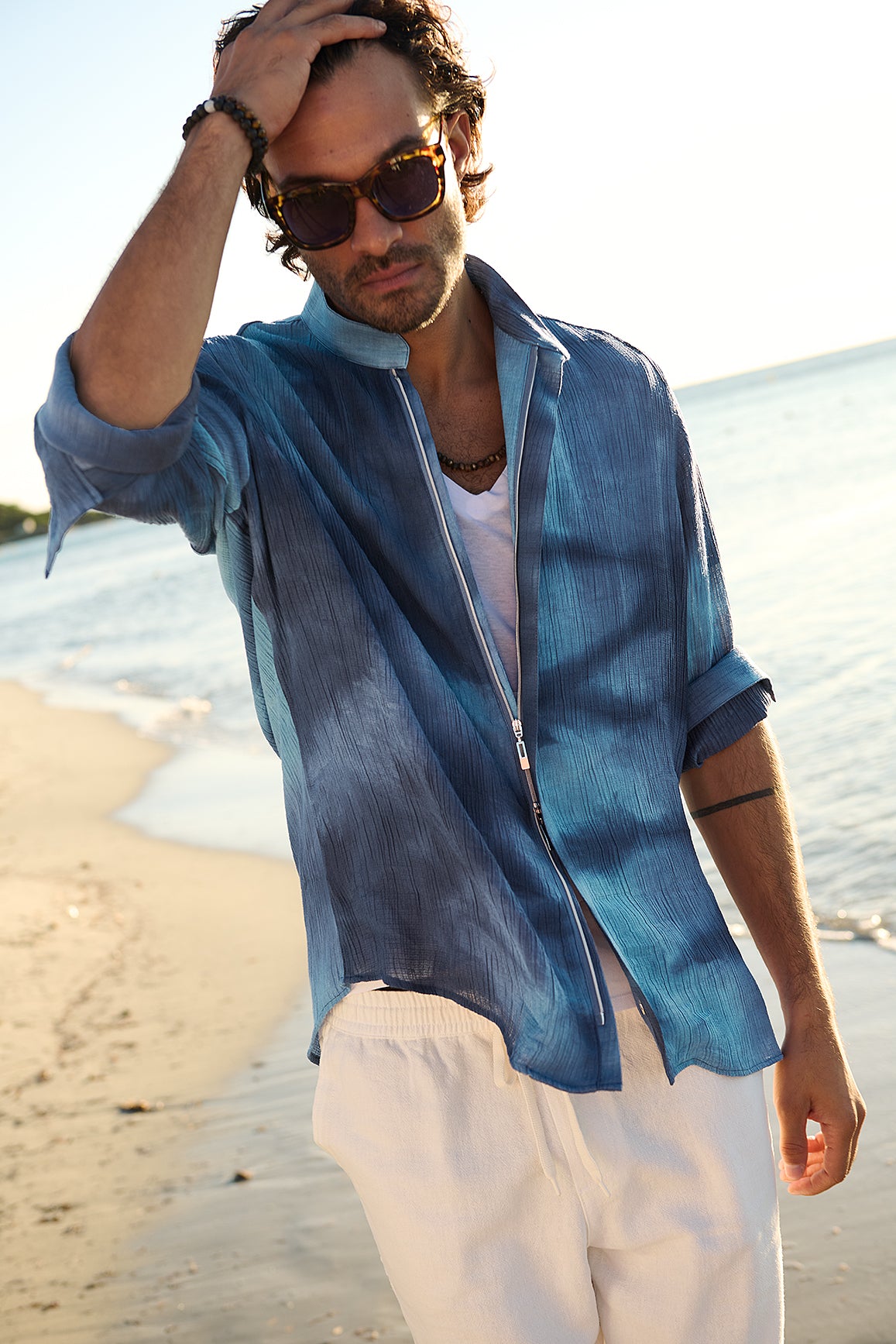 Die Maltinto-Färbung sorgt für eine lebendige, unregelmäßige Farbverteilung aus zwei harmonisch aufeinander abgestimmten Blautönen – jedes Hemd wirkt dadurch individuell. Das leichte, fließende Material mit hohem Viskose-Anteil trägt sich angenehm kühl und bewegt sich weich mit dem Körper.