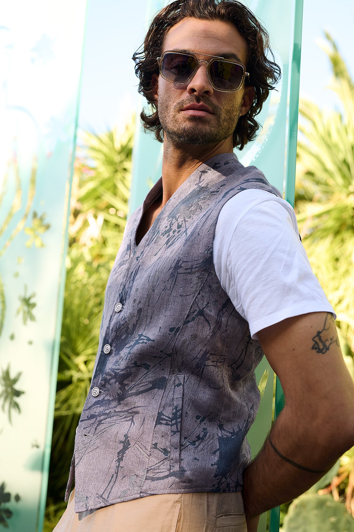 Die Weste Loup ist ein außergewöhnliches Stück aus 100 % italienischem Leinen, das durch seine kunstvolle Färbung und raffinierte Schnittführung besticht. Das aufgedruckte Muster erinnert an handwerkliche Färbetechniken, bei denen blaue Farbbeutel den Stoff unregelmäßig besprenkeln – jedes Stück wirkt so individuell wie ein Kunstwerk.